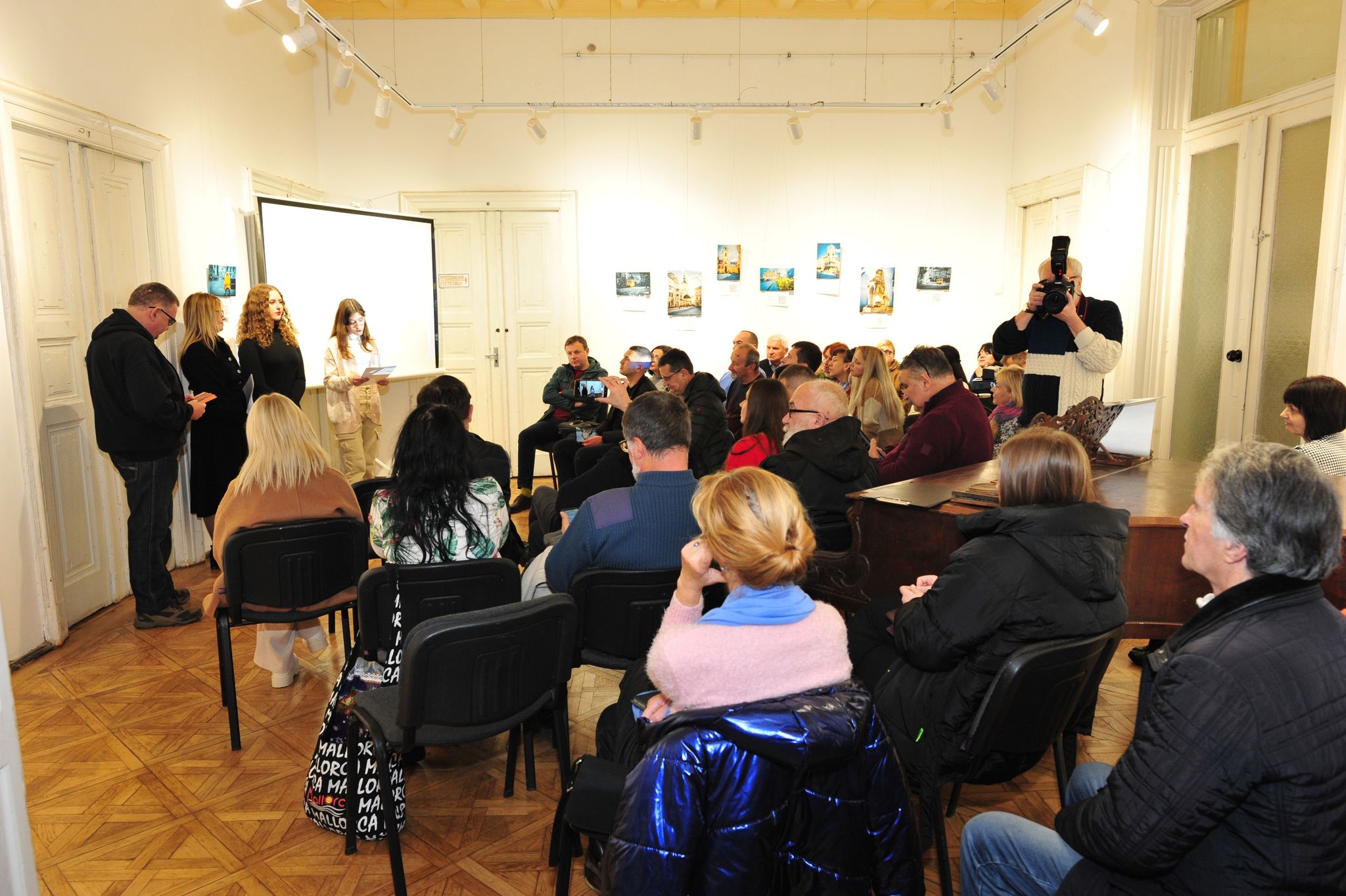 З невеликою затримкою все таки розпочинаємо. Після представлення моєї персони пані Надією вступаю в гру. Скажу лише, що не вперше є організатором презентацій чи урочистих частин, та все ж є прихильником неформального формату спілкування. Це допомагає залучити аудиторію до теми та дискусії. Так і цього разу коротко розповівши про концепцію виставки переходжу до більш приємних моментів – привітань та презентацій. Перше привітання яке оприлюднив у відеоформаті для мене стало справжнім приємним сюрпризом і поступило воно з далекої Антарктиди від фотографа та біолога Сергія Глотова.