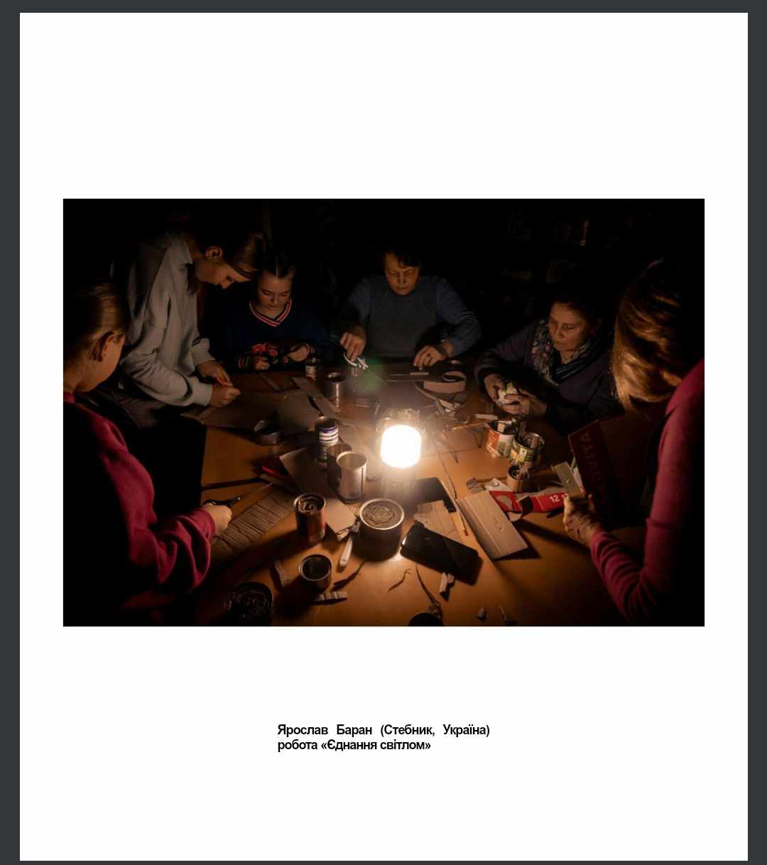 Насправді це ціла серія світлин, яка розповідає про життя та діяльність волонтерів у часі війни. Проте саме обрана світлина як найкраще розповідає про те, як люди гуртуються біля спільної ідеї незалежно від обставин та поколінь. У кадрі процес виготовлення окопних свічок. Пригадую цей день коли усе відбувалося – місто поринуло у темряву через планові відключення електрики. Проте ця неприємність не зупиняла волонтерів у досягненні цілей. Взагалі ці волонтерські зустрічі відбувалися дуже цікаво, адже за роботою була можливість спілкуватися, познайомитися і ділитися ідеями. Такий собі комунікаційний центр. І приємно що таку об’єднавчу місію у рідному місті взяла на себе місцева бібліотека. Вважаю дану світлину не лише репортажною, але й історичною принаймні в контексті історії краю.
