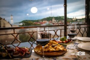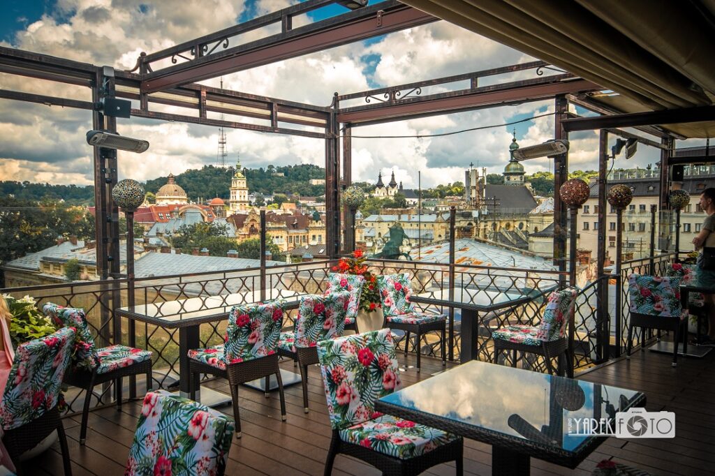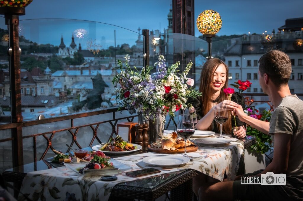 Третьою і найсильнішою складовою готелю Швейцарський є оглядова тераса на верхньому 7-му поверсі з неймовірним видом на старий Львів. Якраз наше знайомство з цим місцем відбулося під час зйомки фотосесії на тему «Романтичне побачення».