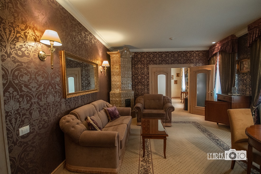 Якщо ви запланували зйомку в номері, краще все ж таки обирати номери з темним покриттям стін. Вони краще будуть підкреслювати деталі і краще передають аристократичний дух. Пробна сесія в номері зі світлим покриттям стін затребувала чималеньких зусиль щодо пошуку кольорової схеми для корекції. Також враховуючи що в готелі постійно напівпригашене світло, про спалахи чи постійне світло треба подбати заздалегідь. Для отримання хорошої картинки таки б рекомендував студійні спалахи чи стаціонарне світло оскільки з накамерним спалахом досягти цікавої і студійної картинки тут буде дуже складно.