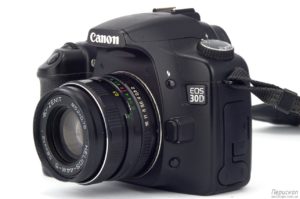 Власне ми підійшли до моменту як подружити об’єктив з сучасним дзеркальним фотоапаратом. До свого Кенона довелося докупити перехідник типу М42-EOS. Благо звичайна версія коштує копійки, тому спочатку накручуємо його на об’єктив по різьбі, а далі орієнтуючись на червону цятку вставляємо його в камеру як EF-оптику. Усе камера та об’єктив готові до роботи.