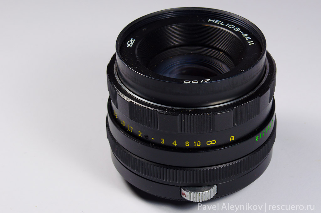 Відверто визнаю, що уже згодом довідуюсь – версій Геліос 44 була сила силенна. Найстаріші це 44-2, а усе, що йшло після серії «М» це уже нові версії. І залежно від цифри, яка стояла поза «М» означало, що це новіше покоління. Я зрозумів, що в моєму випадку я тримаю перший з еМок. Хотілося дуже вірити, що «М» означає “модернізований”, та насправді нічого подібного. «М» вказувала на те, що в об’єктив вмонтований механізм так званої моргаючої діафрагми, або скачкоподібної діафрагми. Досі не розібрався як цей механізм працює і взагалі навіщо він, та все ж на його наявність вказує перемикач на об’єктиві і контрольна кнопочка на тильній стороні об’єктива. Одразу скажу, що на сучасних апаратах цією опцією скористатися таки не вдасться: прикручуючи об’єктив дана опція блокується.