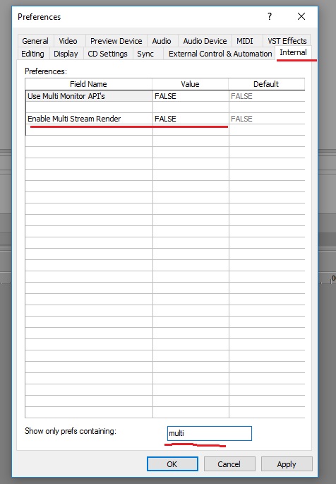 - Нам необхідний Enable Multi Stream Render. Навпроти нього слово FALSE замінюємо на TRUE. Не забуваємо це усе примінити. І швидше за все програма запропонує закрити її і ще раз запустити, щоб зміни вступили в силу.